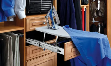 Rev-A-Shelf has ironed out the inconvenience of storing and setting up that bulky ironing board with the introduction of its CIB Series. The uniquely designed expandable frame mounts easily in a closet between panels and the fixed brackets allow for easy mounting of all standard drawer fronts. It features a chrome finish and a unique ball-bearing slide system that provides sufficient over travel for maximum utilization. Simply open until the gravity lock engages, unfold board and you are ready to iron!